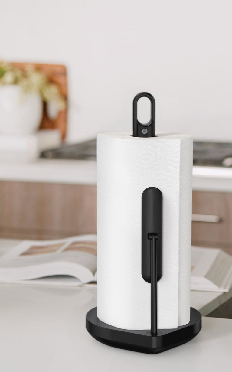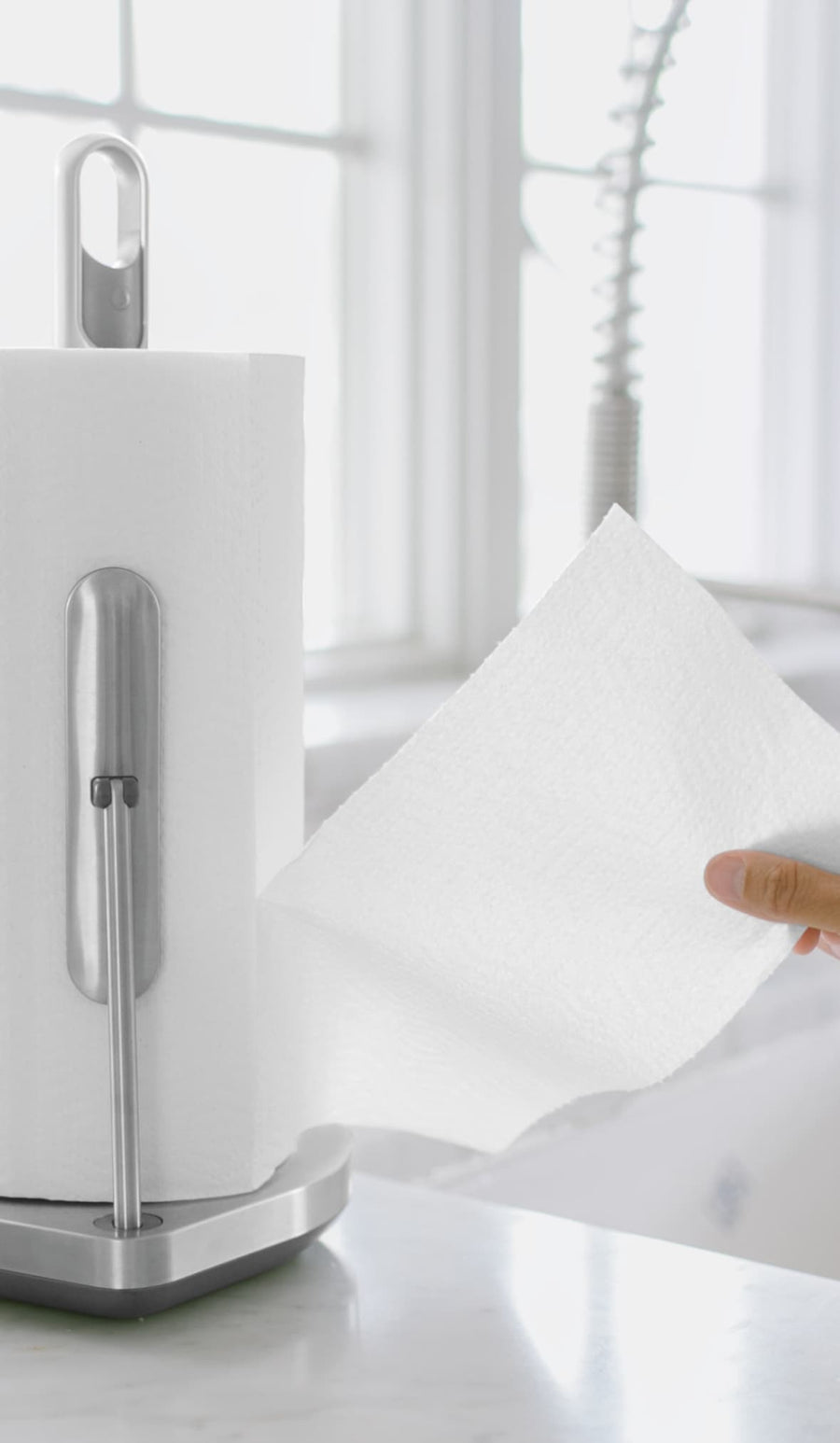 細部にまでこだわった私達のペーパータオルホルダーは、ロールを適度な力で押さえているので、片手で楽に切り取ることができます。