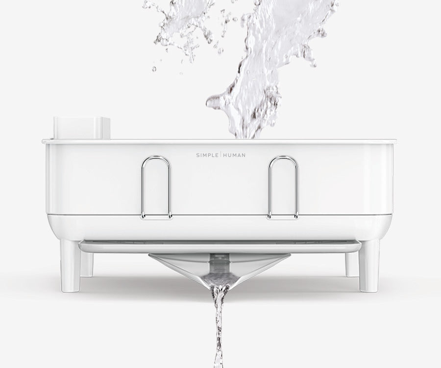 素早く清潔に水切りができ、水溜りや水滴、水垢を残しません。ディッシュラックをどの角度に置いても、回転スパウトでシンクに排水できます。